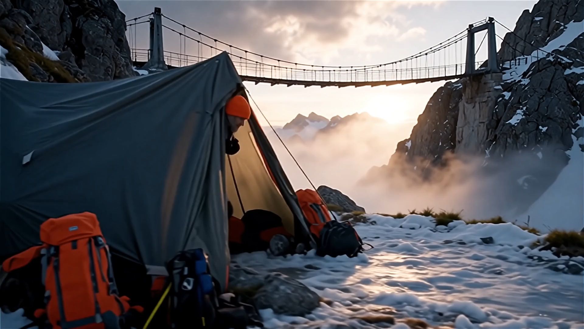 Highly cinematic video, multiple dynamic camera angles, the construction team leaving their bivouac and go to a giant bridge between two mountains. As they reach the bridge, they lay down their backpacks and put on their warning jackets. Close-up of a team member radioing the base station: "We reached the bridge and are ready for repairing... send the heli!"