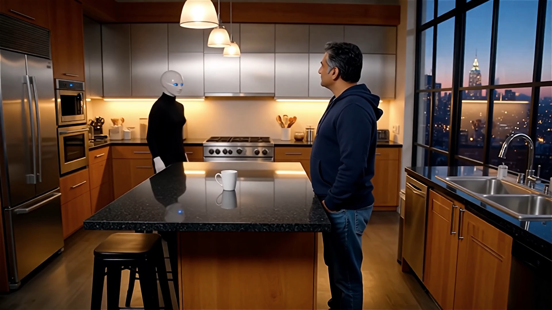 Wide cinematic shot of a modern apartment kitchen. Warm practical lights, controlled contrast. An AI character and a human stand at a counter. A coffee mug sits between them. Camera locked off, composed like a feature film.