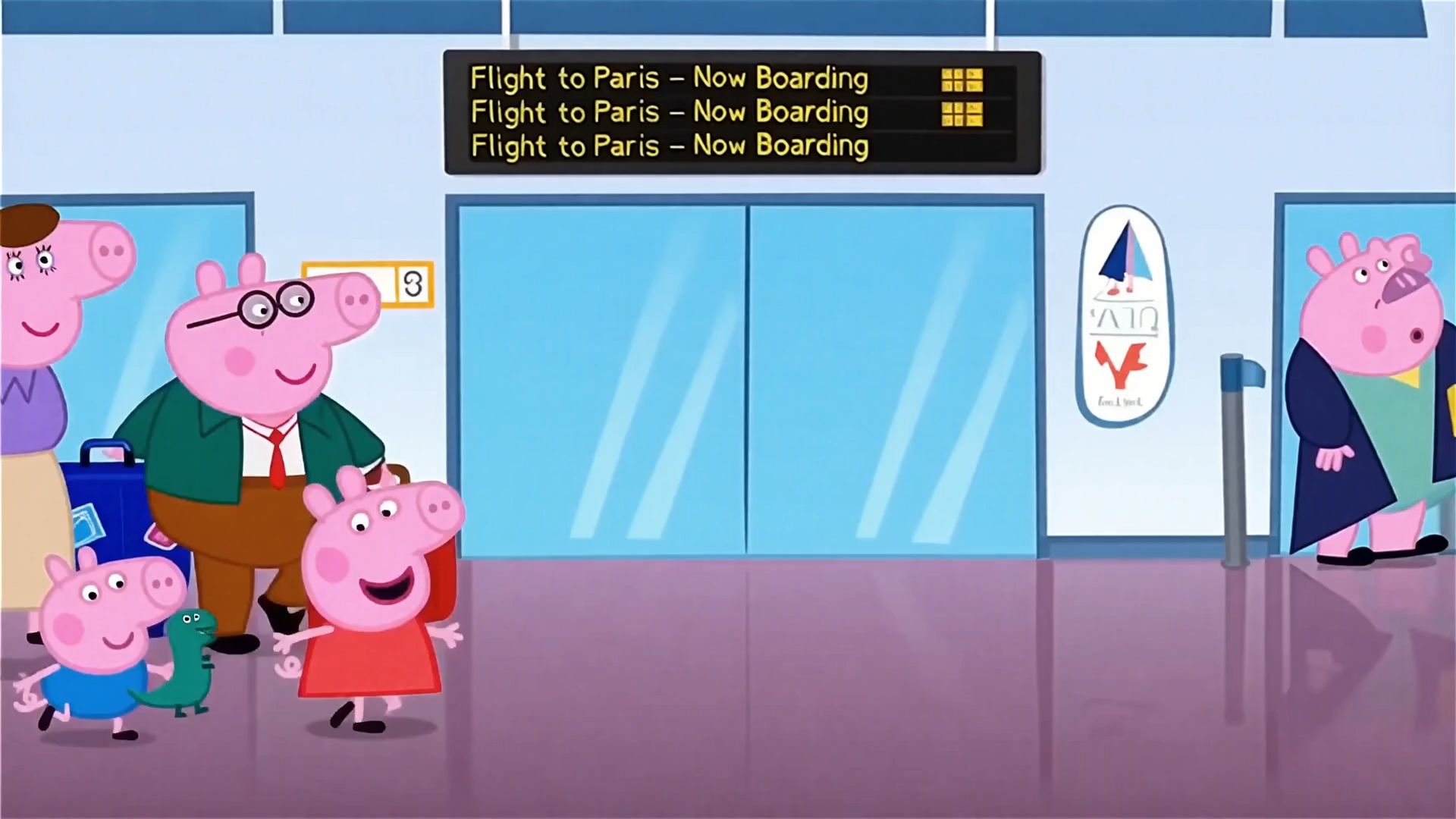 A cheerful animated adventure featuring Peppa Pig and her family booking a flight to Paris, packing colorful suitcases, arriving in sunny Paris, France, greeted by friendly French locals saying “Bienvenue à Paris!” in cheerful French, welcoming them to Paris, and her family saying ''Merci!'' in cheerful French, exploring iconic landmarks, immersing in French culture, learning basic French phrases, joyfully performing the Can Can dance in a lively village square, and savoring fresh baguettes and croissants at a charming French bistro. Bright, vibrant, child-friendly 2D animation style, emphasizing warmth, curiosity, and cultural discovery. High-quality, HD, engaging, family-friendly content.