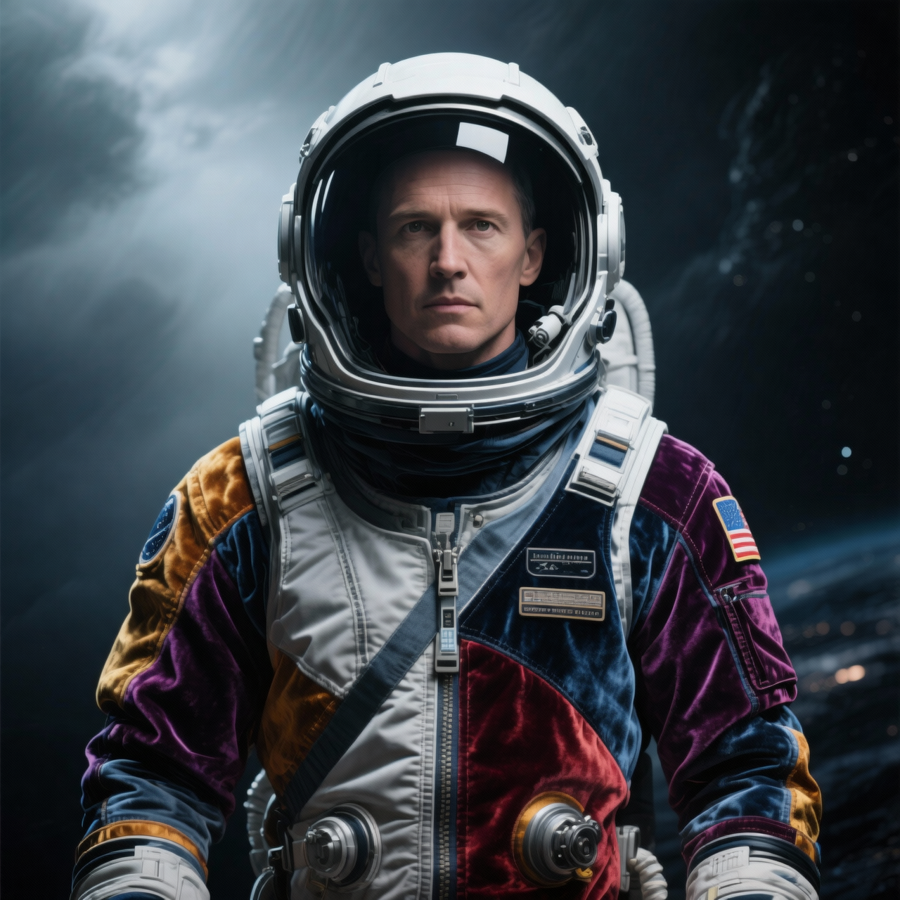 A stunning, high-definition portrait of an astronaut in a sleek jumpsuit, set against a moody, atmospheric backdrop with subtle, gloomy illumination, showcasing exceptional craftsmanship and attention to detail, reminiscent of a professional, award-winning masterpiece, featuring vibrant, rich colors, rendered in a luxurious, velvet-like poster style, with intricate textures and sharp, crystal-clear definition, exceeding 8k resolution with precise, high-fidelity HDR and UHD qualities.