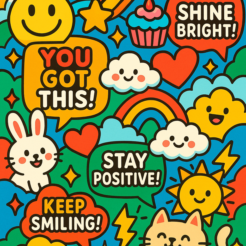 A colorful and uplifting cartoon sticker collage in bright saturated colors, Western cartoon style. The image includes a dense variety of layered stickers such as smiling faces, happy clouds, shooting stars, colorful rainbows, red hearts, sparkles, lightning bolts, speech bubbles, cute animals (like cats, dogs, bunnies), cupcakes, and motivational English phrases like 'You Got This!', 'Shine Bright!', 'Stay Positive!', and 'Keep Smiling!'. Style is cheerful, energetic, vibrant and bright, with thick outlines and pop-art aesthetic. Designed for planners, notebooks or apps.