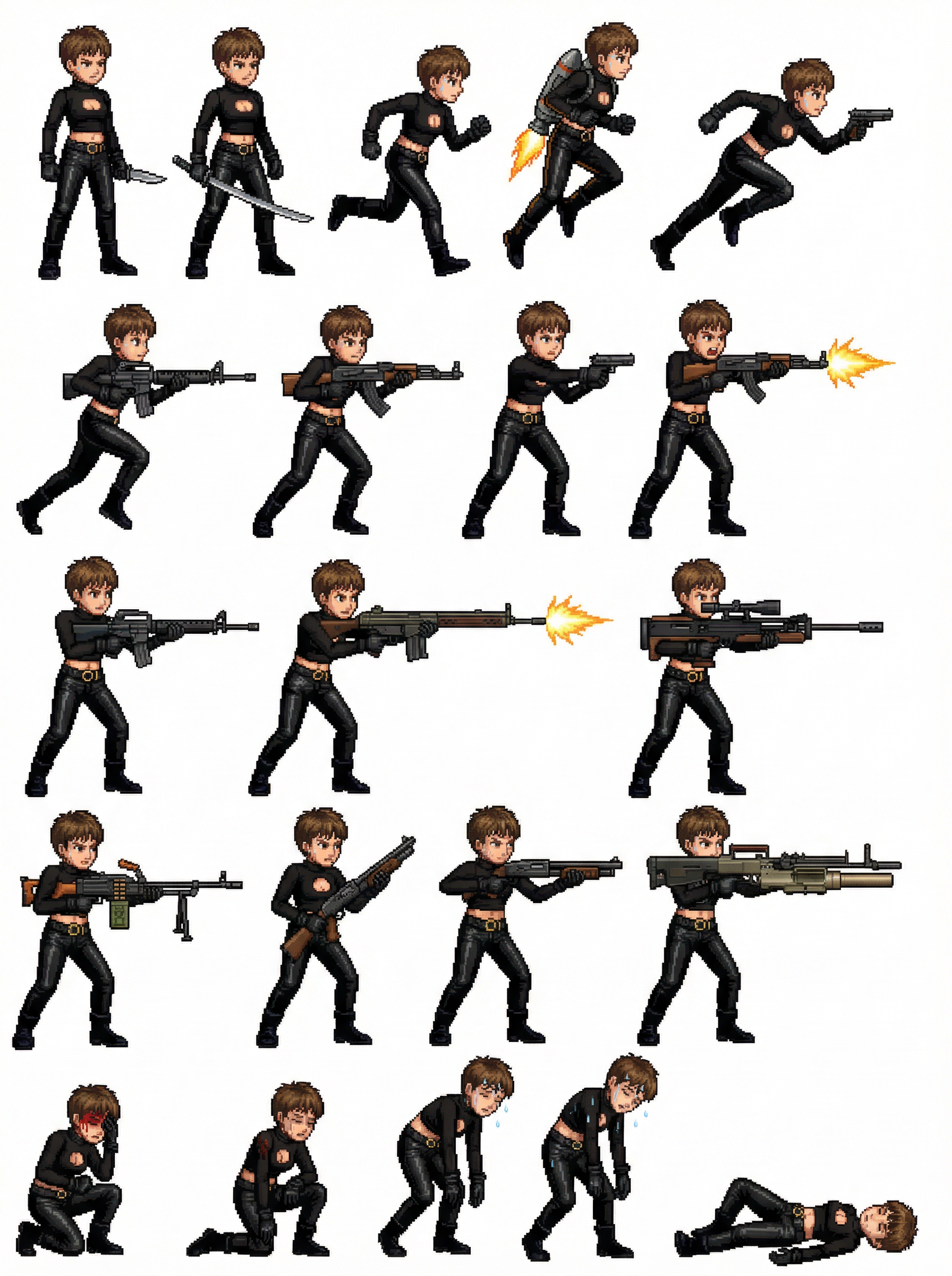 remove text and logo. replace second image person with first image woman in left with same style. standing, intense, gunfire, action packed, attacking, gameplay, 2d pixel art, generate different set of sprites; movement, jumping, attack, reloading, death, injured on low health, exhausted and sweaty, dodge, dash, jetpack, unlocking, etc.