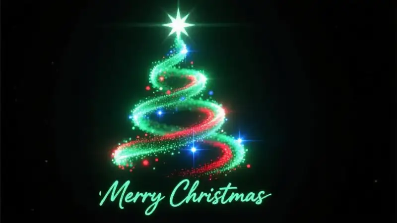 创作一幅以圣诞为主题的数字艺术作品,主体为用闪烁极细小粒子螺旋上升组成圣诞树大致轮廓(边缘不清晰),树顶点缀明亮璀璨的极小的星形光效;背景采用纯黑色,底部被粒子照亮营造氛围感;运用粒子光效、星光闪烁、渐变晕染技法,风格偏向梦幻抽象与霓虹科技感结合;构图以圣诞树为中心对称布局,底部偏下位置用手写连笔字体呈现“Merry Christmas”,字体优雅飘逸;材质模拟宇宙星尘流动的光影质感,画面层次分明,背景暗沉衬托中间发光粒子树的明亮,顶部星星高光突出,底部文字与粒子柔和呼应;细节上粒子大小错落有致,螺旋线条流畅自然,星光带有光芒扩散效果,整体色调冷暖对比中凸显节日温馨与未来感,排版上文字与视觉主体平衡且富有艺术感。 红蓝色作为点缀,绿色为主色调