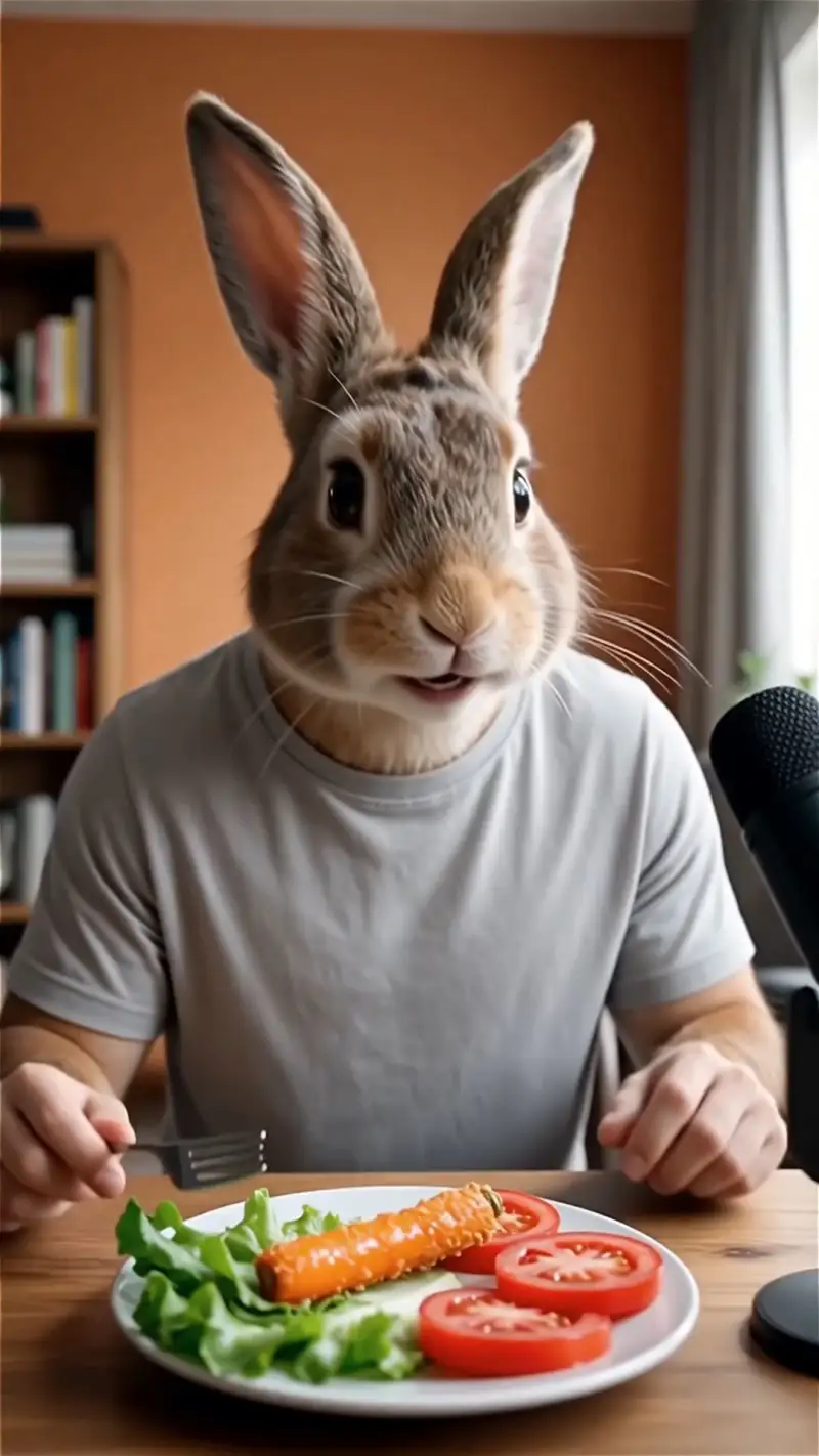 ultra‑photorealistic live‑action style ASMR food vlog video, 4K, 24fps, shallow depth of field, soft warm lighting. An anthropomorphic, highly realistic rabbit vlogger (soft white and light‑brown fur, expressive eyes, wearing a simple casual T‑shirt) sits at a wooden table in a cozy modern room, facing the camera like a YouTube ASMR creator.