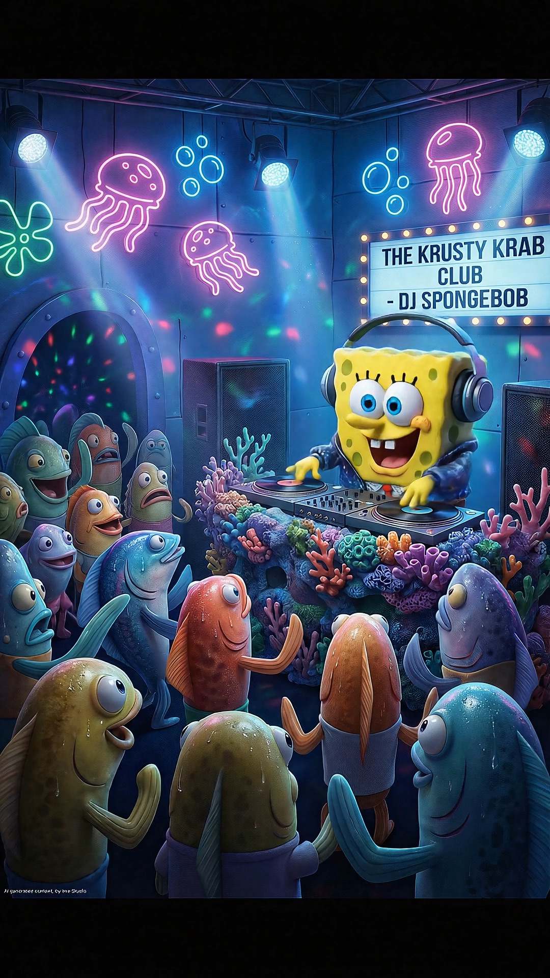 A neon-lit underwater nightclub inside the Krusty Krab. SpongeBob SquarePants stands behind a professional DJ booth, wearing oversized headphones, joy etched into his face as he scratches vinyl with confident, rhythmic movements. Colorful reef coral wraps the DJ table. A packed crowd of animated fish dances tightly in front of him, fins waving, bodies bouncing in sync.