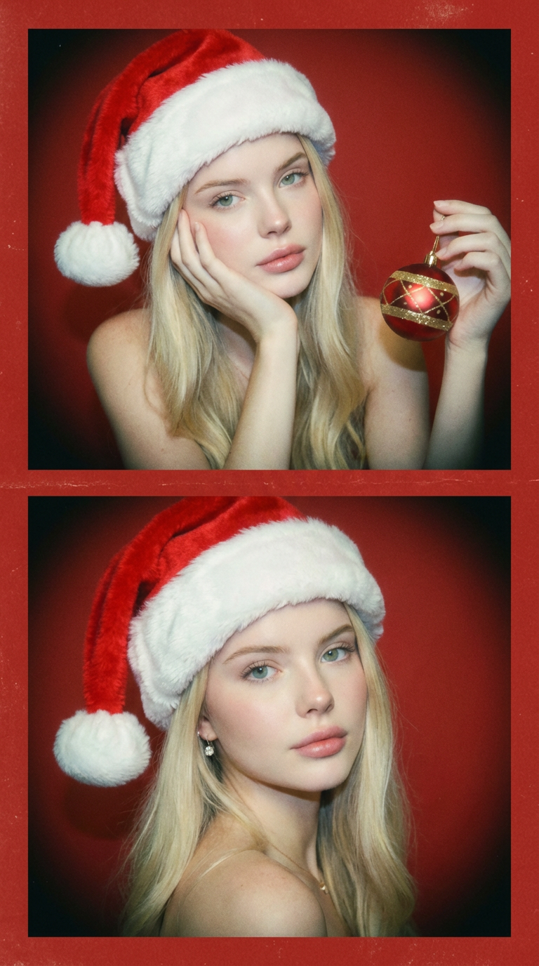 Two-panel layout, retro red background, LOMO style, CCD shooting effect, vignetting, graininess, low resolution, retro film texture, girlish online style, medium shot, cool-toned fair skin, clear and natural makeup, cute and innocent charm, soft and smooth skin like jade, pure and hazy filter, earrings, Christmas atmosphere, cute expression, languid pose, the overall posture conveys a unique charm of being immersed in one's own style, showing a soft and cute temperament, high-value appearance. Top panel: One hand supporting the face, wearing a Santa hat, holding a Christmas ornament. Bottom panel: Girl looking directly at the camera, wearing a Santa hat, cute expression. Output images only, no text.