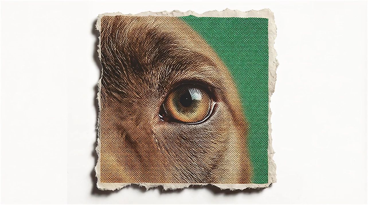 generate a video of the dog's eye blinking inside the paper clip, fix shot, paper print cut style, grain, halftone texture, make the white background to blue color for keying in