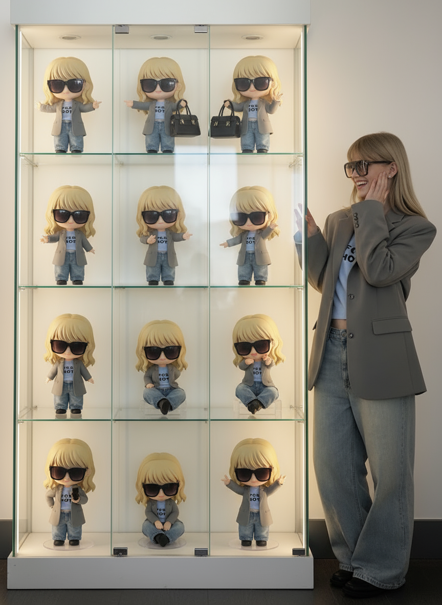 Make the pictures into cute 3D Q-version style figures in different poses, and place them neatly in the glass figure display cabinet in order, 3 rows and 3 columns, with a 3D figure in each grid. The characters in the pictures look at these figures happily sideways. Output images only, no text.