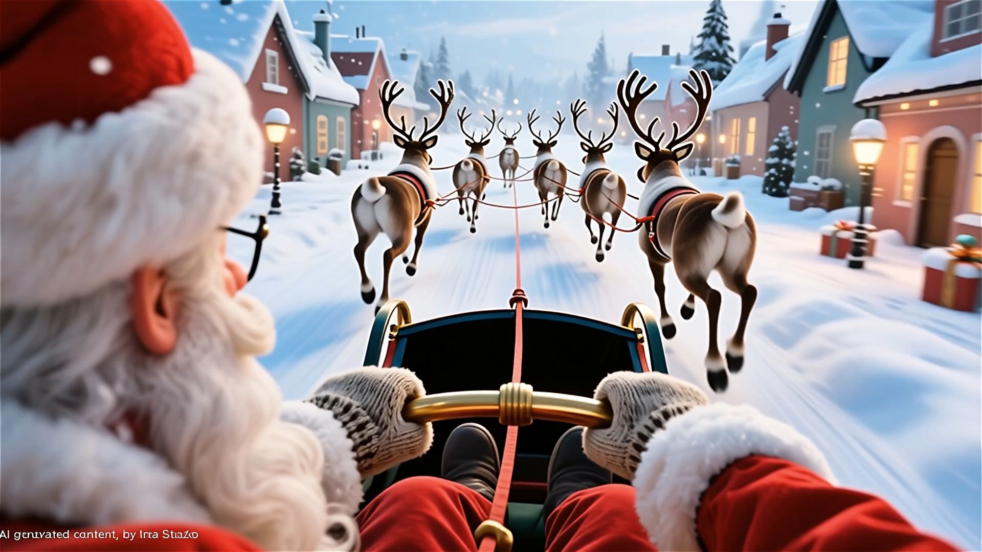 POV, Santa Claus is driving in his sleigh while 6 reindeers are pulling and running in the different direction through a snowy tiny city, hands in some warm gloves are grabbing the handle of the sleigh in front