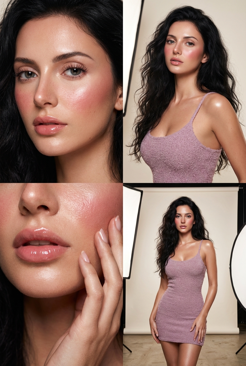 Ultra-photorealistic 2x2 grid collage in high-end beauty editorial style. Features include: long loosely wavy voluminous hair, natural hyper-realistic complexion with dewy, glass-skin effect, makeup-heavy blush, high-gloss natural pink lips, clean lashes, bodycon mini dress in soft textured knit/boucle fabric (soft mauve or neutral taupe), spaghetti straps, mid-thigh length. Studio setup: seamless backdrop in off-white/beige, studio lighting with large softbox (Front-Left) and reflector (Right). Highlight specular details on cheekbones, lips, shoulders. Individual panels styled as per specified positions with macro, medium shots, and full-body scenes. Include nuanced visual anchors like gloss reflections and detailed textures.