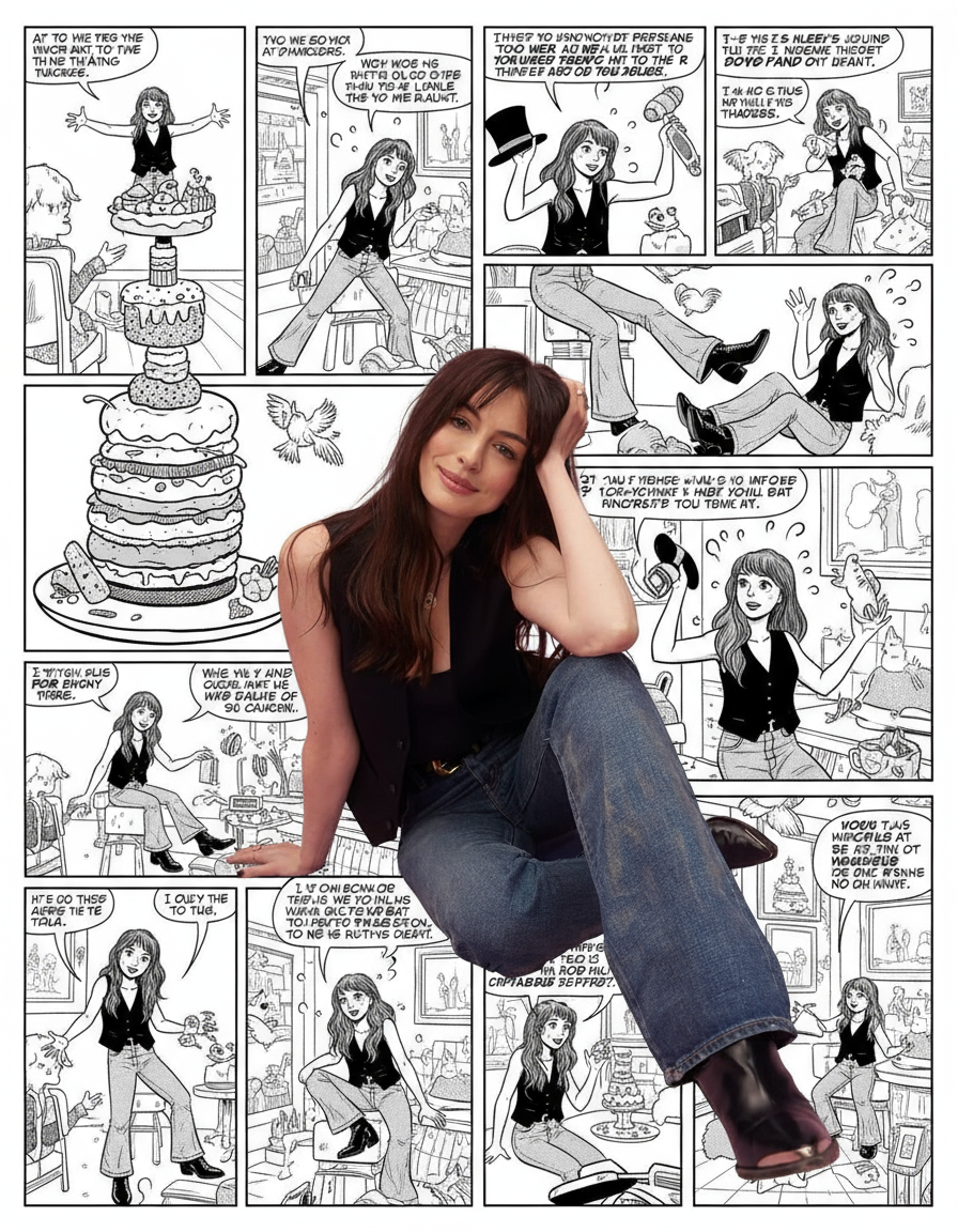 The central figure, extracted from the uploaded image, is rendered in full, vibrant photorealistic color and sharp detail. They are dramatically lit to powerfully stand out. The background is an intricately detailed, multi-panel, black and white comic strip, entirely wordless and filled with humorous, exaggerated narratives directly featuring the central figure. These comic panels should not only depict the subject in funny, light-hearted, or slightly absurd scenarios, but also seamlessly integrate the central figure into the surrounding comic world. The colorful main subject should appear as if they are an integral part of this dynamic, monochromatic comic reality, perhaps stepping out or frozen within a specific comic panel, with their pose and expression directly interacting with the surrounding black and white narrative. The comic panels are drawn in a classic, high-contrast comic book style with bold lines, and creatively arranged to create a cohesive and engaging narrative backdrop, strongly linking the vibrant figure to the detailed monochrome comic environment. Output images only, no text.