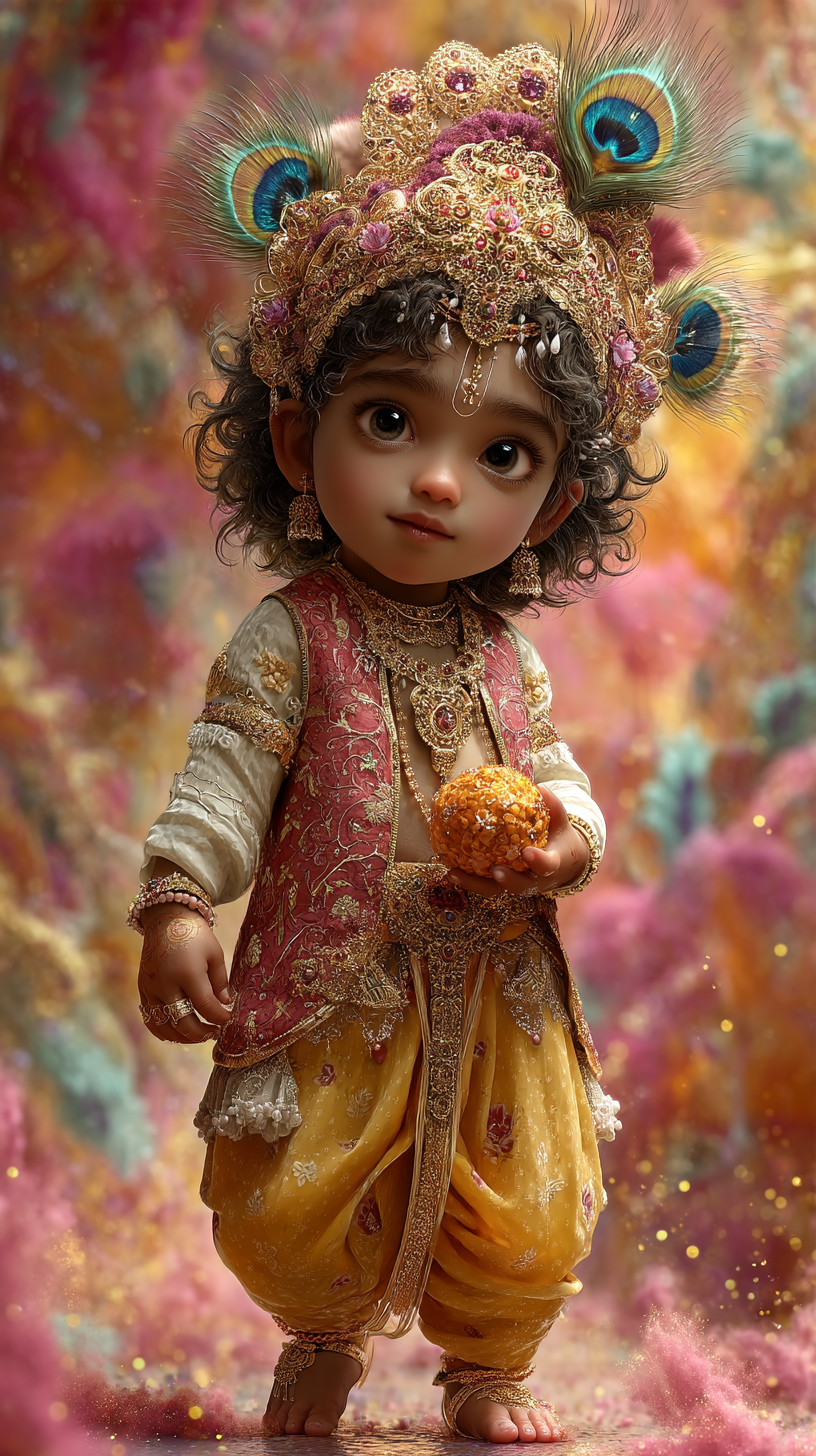Adorable baby Krishna standing confidently, chubby toddler body, luminous fair peachy skin, large expressive brown eyes with mischievous sparkle, rosy cheeks, sweet smile. Ornate golden crown with peacock feather, intricate filigree, gemstones. Curly dark brown hair. Red-orange embroidered vest with golden patterns, yellow silk dhoti with golden border. Heavy golden jewelry—necklaces, armlets, bracelets. Holding golden ladoo in right hand. Surrealistic vibrant background with swirling orange, pink, magenta, yellow color smoke creating dreamy atmosphere. Floating peacock feathers, golden sparkles, bokeh lights. Hyper-realistic 3D render, dramatic cinematic lighting, shallow depth of field. --v 7 --ar 9:16 --stylize 814 --q 2