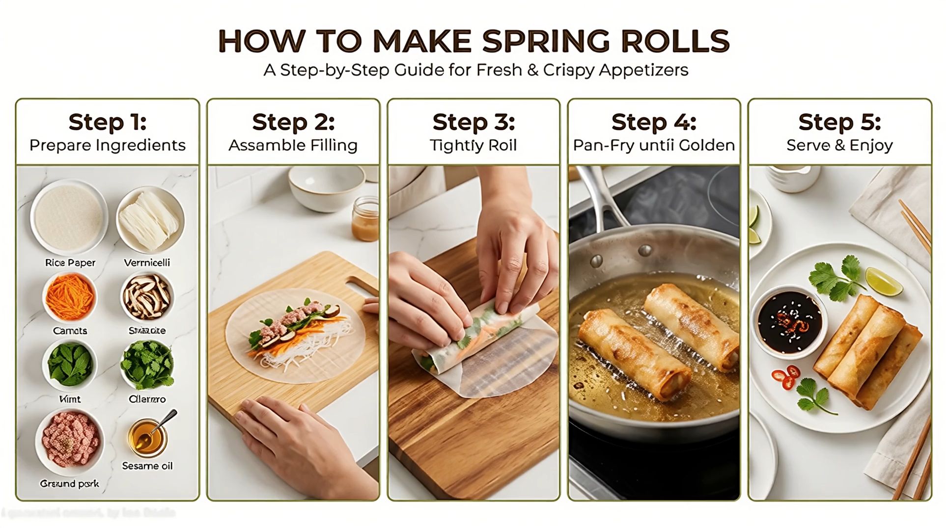 Cooking tutorial showing “How to Make Spring Rolls”, clean modern layout, minimalist flat design mixed with realistic food video, bright natural lighting, Layout Instruction: horizontal strip