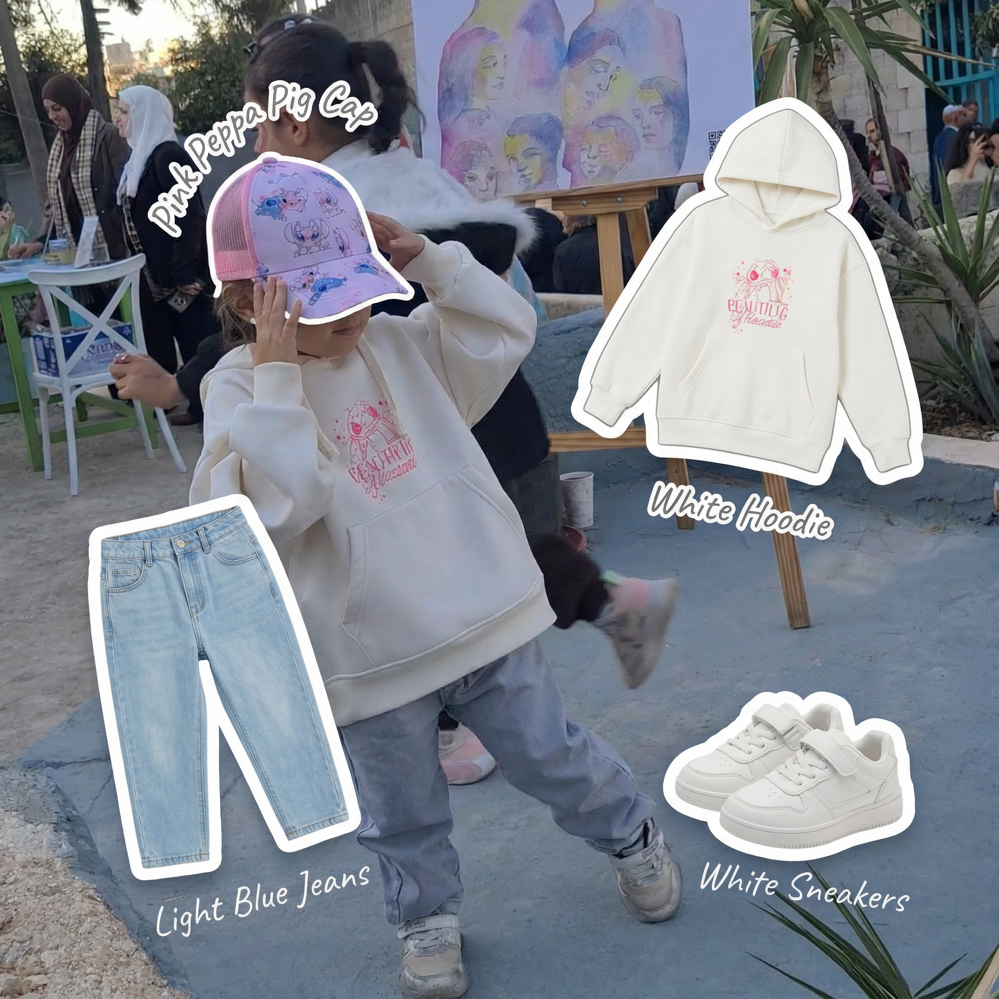Collect each clothing item worn by the girl in the first photo and place them on top of the same photo as flat, cut-out stickers. Keep every piece neatly outlined like a collage sticker. Next to each stickered clothing item, write its name in a soft pencil-style handwritten label, creating an aesthetic fashion-notebook look. Output images only, no text.