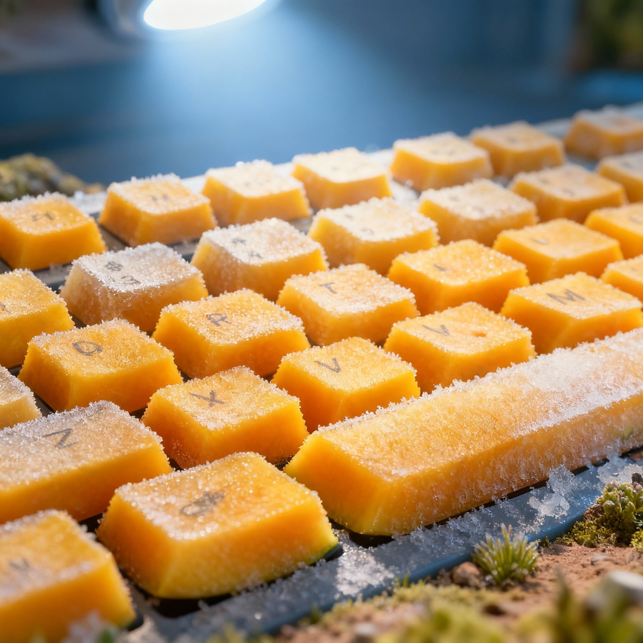A hyper-realistic miniature landscape scene with veo3 style using UE5 rendering technology. A keyboard made entirely of frozen cut mango pieces, where each key is precisely crafted from frozen mango flesh, bright and vibrant colors, surface covered with subtle frost, rich details throughout, exquisite craftsmanship, prominent lighting and shadow effects, creating a unique and interesting visual atmosphere. Output images only, no text.