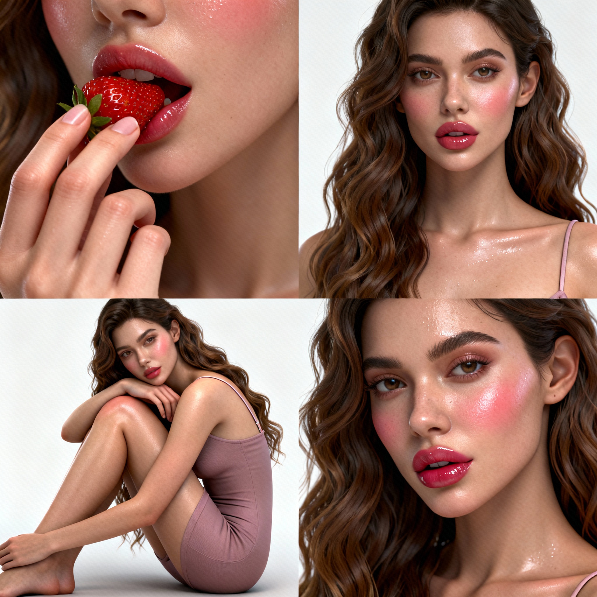 A sophisticated 2x2 grid collage featuring a model with long wavy hair, dewy skin, heavy blush, glossy lips, wearing a soft mauve bodycon mini dress with spaghetti straps. Four panels arranged in grid format: top-left shows extreme close-up of model eating strawberry with delicate finger hold and lips slightly parted, top-right shows medium shot of model standing straight with direct gaze and alluring pout, bottom-left shows full body seated side profile with knees to chest pose and cheek resting on knee, bottom-right shows additional beauty shot. Ultra-photorealistic rendering with ray-traced studio lighting on seamless off-white background.