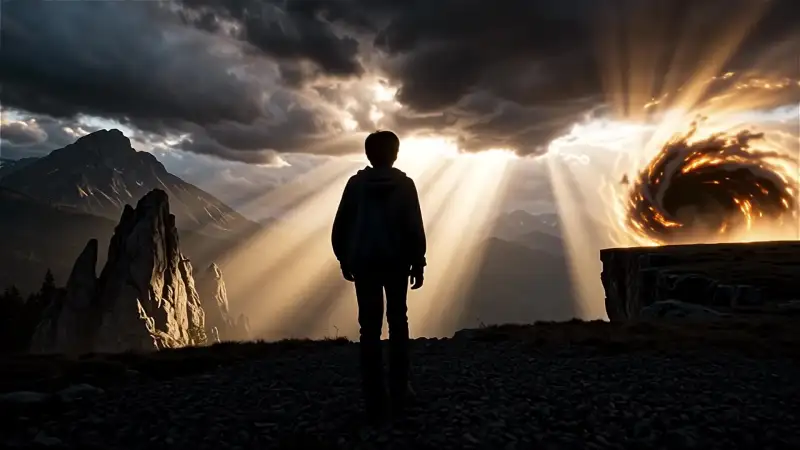 The sequence starts with a low-angle wide shot from behind the boy, showing his small frame against the gargantuan scale of the mountain range and the glowing sky. The portal isn't static; it’s a living storm of golden embers and obsidian shadows. The camera transitions to a medium tracking shot that circles the boy as he reaches his hand toward the sky, his fingers illuminated by the shimmering rift. Suddenly, the "shock" occurs: the portal pulses, and for a split second, the reflection of a futuristic city appears within the light. The camera then performs a high-speed cinematic zoom into the eye of the portal, moving past the boy at a dizzying pace. Lighting is theatrical, using "God rays" that pierce through the dark clouds, hitting the cliffside in rhythmic flashes. Audio: A cinematic masterpiece of sound design. It opens with the lonely sound of footsteps on gravel and a distant, ethereal choir. As the portal pulses, the epic music explodes into a hybrid of orchestral and synth-heavy trailer music. Foley effects include the "whoosh" of the camera zoom and the crystalline chiming of the portal’s energy. The narrator’s voice is layered with a slight echo: "History is written by those who stay on the ground. But legend... legend belongs to the boy who decided to fly into the eye of the storm." The audio cuts to a sudden, ringing silence in the final half-second.