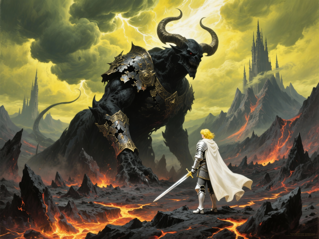 in the style of traditional high-fantasy book cover art, 1980s–1990s epic fantasy illustration, timeless mythological aesthetic of a colossal black knight-like beast with curved horns, towering over a battlefield of jagged volcanic rock. A lone golden-haired knight in radiant white armor and flowing cape stands at the creature’s side, sword drawn, dwarfed by the monster’s immense scale. The beast wears fragments of ancient, ornate armor fused into its body, suggesting a cursed or godlike entity. The sky is filled with swirling yellow-green storm clouds, torn open by eerie light, while distant spires and shattered mountains pierce the horizon. The ground smolders with glowing embers and molten cracks. Dramatic perspective, low-angle composition, mythic confrontation, sense of impending doom and tragic heroism.