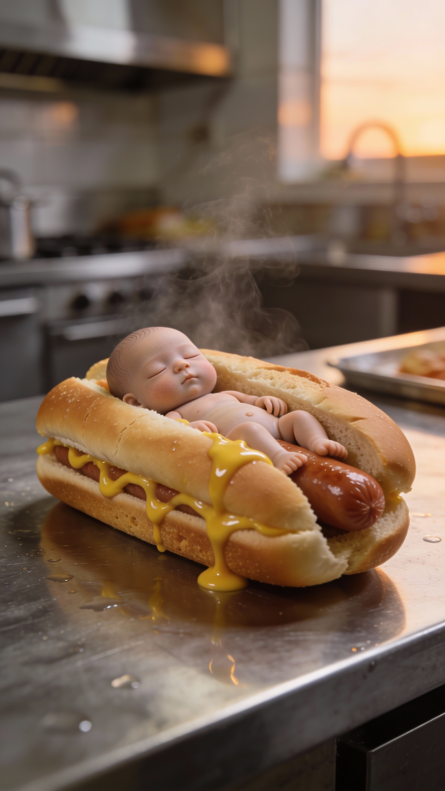 with medical mannequin realism, resting peacefully inside a freshly baked hot dog bun