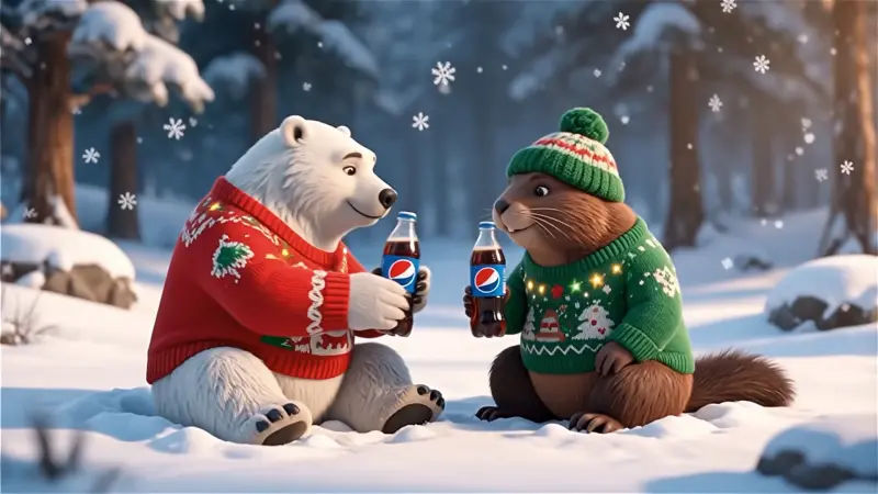 A Polar Bear and Female Canadian Beaver both wearing ugly Christmas sweaters and winter clothing, sit in the snow together toasting each other with a Christmas themed Pepsi bottle, then taking a sip, soft Christmas bells ring. no speech. dramatic dolly zoom in.