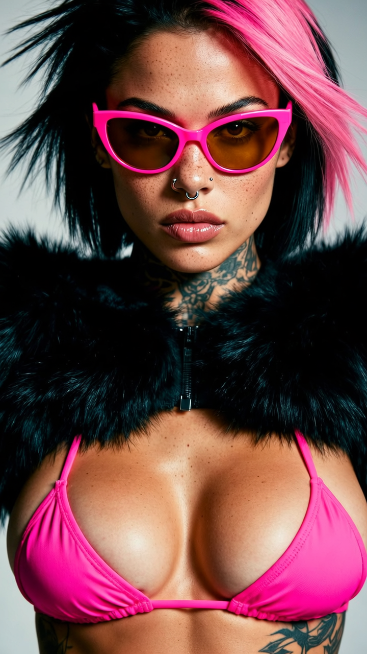 full body view of an incredible beautiful tanned tattooed slim busty female supermodel with an intense, serious expression and black-pink wild one-sided hair. She is wearing a cropped fluffy black faux fur jacket, adding a striking contrast. The model wears a neon-pink micro-string bikini and bold neon-pink wraparound sunglasses with reflective brown lenses, drawing focus to her eyes. Their facial features should include full lips, a small nose ring, and a septum piercing. The skin should have visible texture with freckles, and the lips should be glossy for a fresh, modern look.
