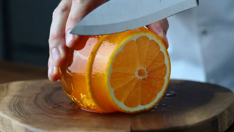 3. Highly realistic ultra 8K ASMR video of a human hand slicing a hyper-detailed, glass sculpture of a (orange) on a wooden cutting board. The object resembles glossy blown glass — reflective, slightly tinted, and sparkling with internal highlights. The camera is in close-up with shallow depth of field, capturing cinematic lighting7AK and detailed glass textures. The knife moves smoothly and deliberately, making three separate satisfying cuts - one after another - creating 3 to 4 clean, evenly spaced slices. Each stroke feels precise and crisp, with realistic slicing sound and natura • o motion. The sliced pieces gently separate, glimmering like cut crystal. Within the slices you see crystal glass like prism in the lemon slice. background distractions, same iconic camera angle as professional food ASMR videos..