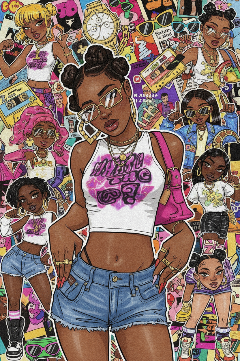 Collage strokes, old-fashioned pictorials, exaggerated poses, exaggerated expressions, character images consistent with reference images, old-fashioned QQ show character full-body portraits, subculture, old-fashioned style, HD y2k trend fashion, dopamine confusion points, maximalism, various decorative luxury goods, comics, slightly messy strokes. Output images only, no text.