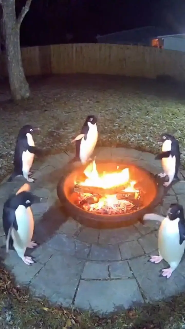 写实风格,监控视角,夜间后院场景,画面中间有一个火盆,火盆中燃烧着火焰,火盆周围围着5只阿德利企鹅,企鹅伴随着音乐在跳舞,音乐为鬼畜,动感,富有节奏的音乐,企鹅的动作跟随音乐而动,