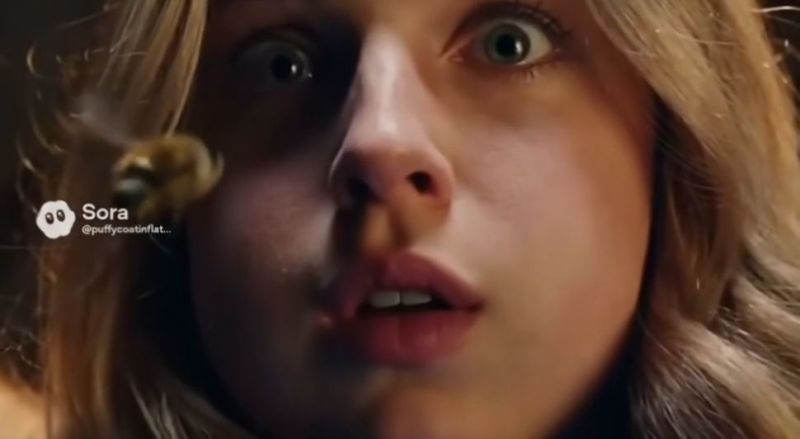 A young beautiful white-skinned woman has puffy cheeks when a bee approaches up to her. The bee stings one cheeks at a time to make it swell up, and inflate like balloons.
