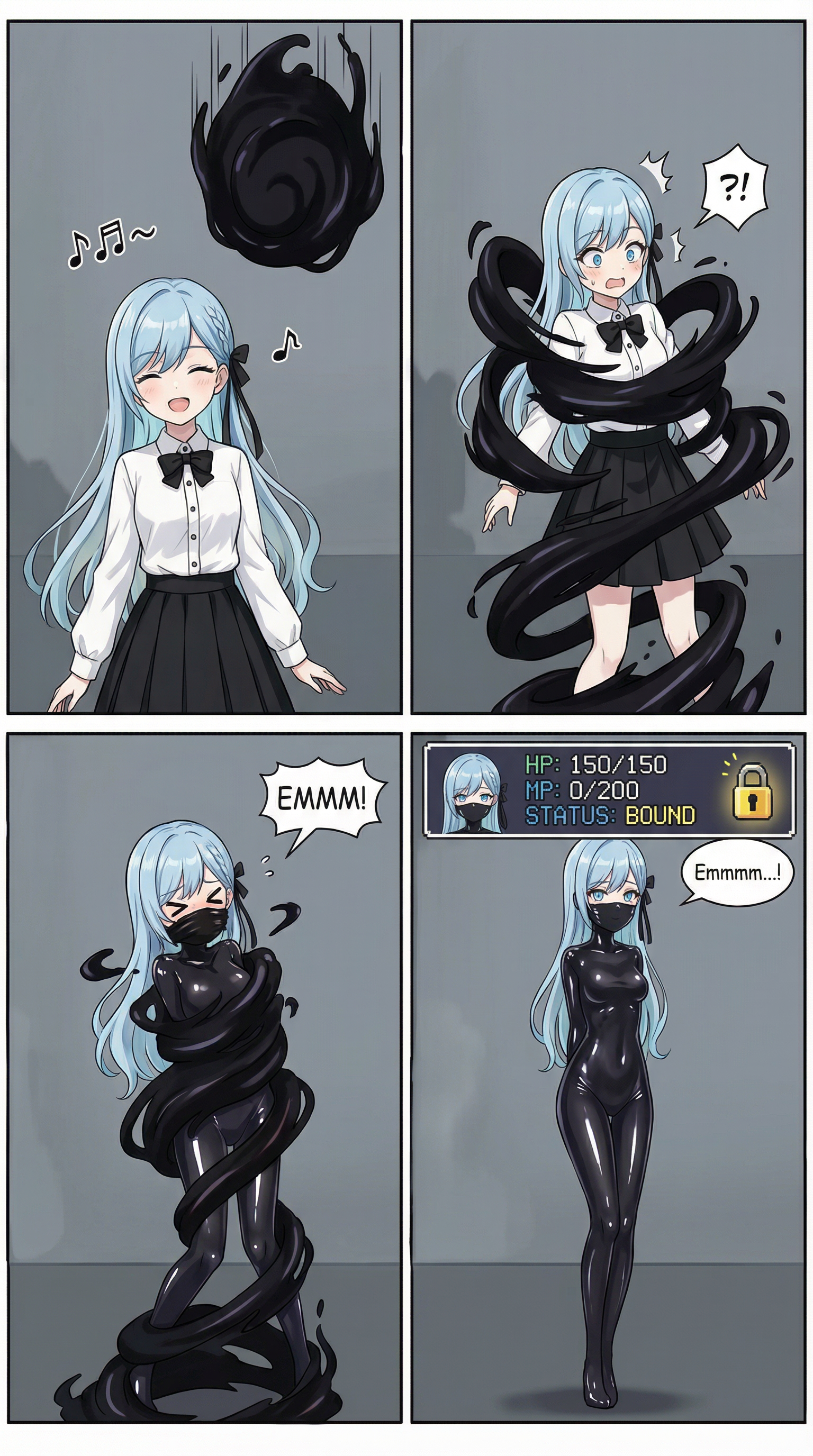 严格提取图1角色的五官和面貌,严格还原图1角色的眼睛颜色、发型、发色和衣服,不要保留挎包。请生成一张和图2的构图风格和构图艺术一样的漫画图,将图1角色与图2角色进行替换,图1角色动作严格还原图2角色姿势。漫画最后一格的头像要根据图1角色进行修改。请保留图中出现的任何字母或汉字。