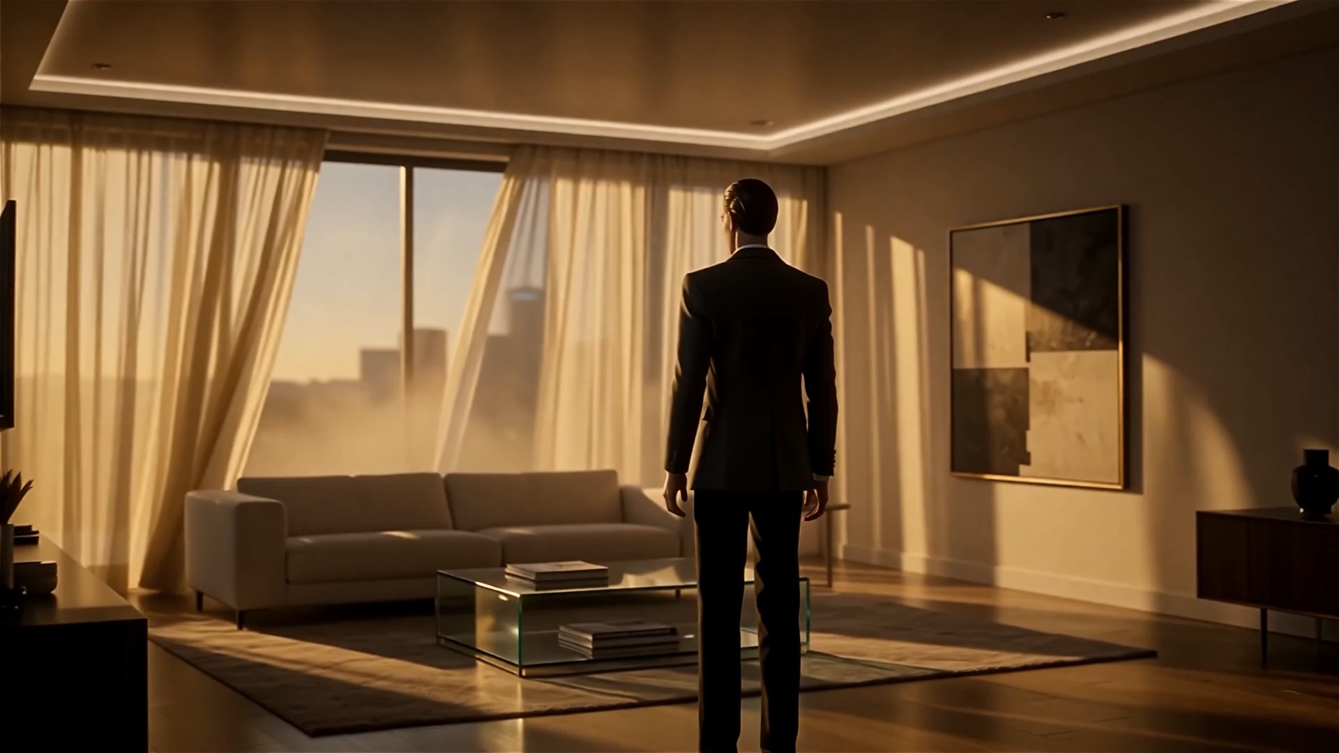 Wide, moody shot of an elegant apartment at dusk. Golden hour light through sheer curtains. The AI character stands alone, perfectly framed, wearing a tailored jacket and shirt. Absolute stillness.