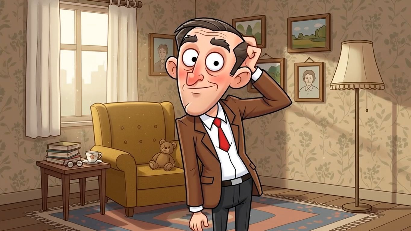 The animation begins inside a modest, cozy apartment living room inspired by classic British sitcom interiors. The room has muted colors, patterned wallpaper, a simple armchair, a standing lamp, and framed pictures on the wall.