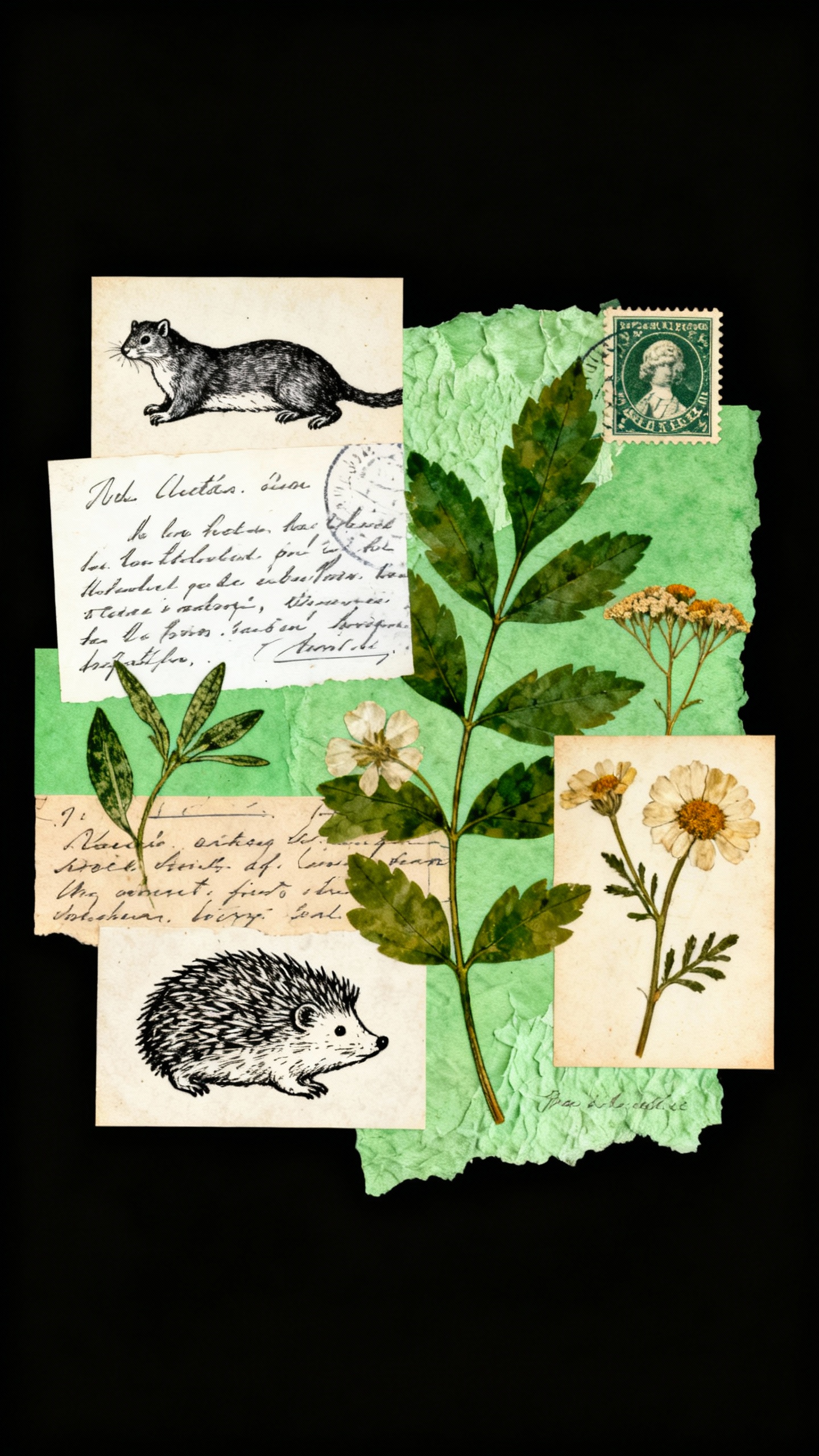 Hand-drawn collage forest story artwork with natural inspiration, featuring plants animals stamps postcards handwritten notes pressed flowers layered composition organic textures nostalgic feeling green color palette handcraft aesthetics dadaism mixed media creative combination. Output images only, no text.