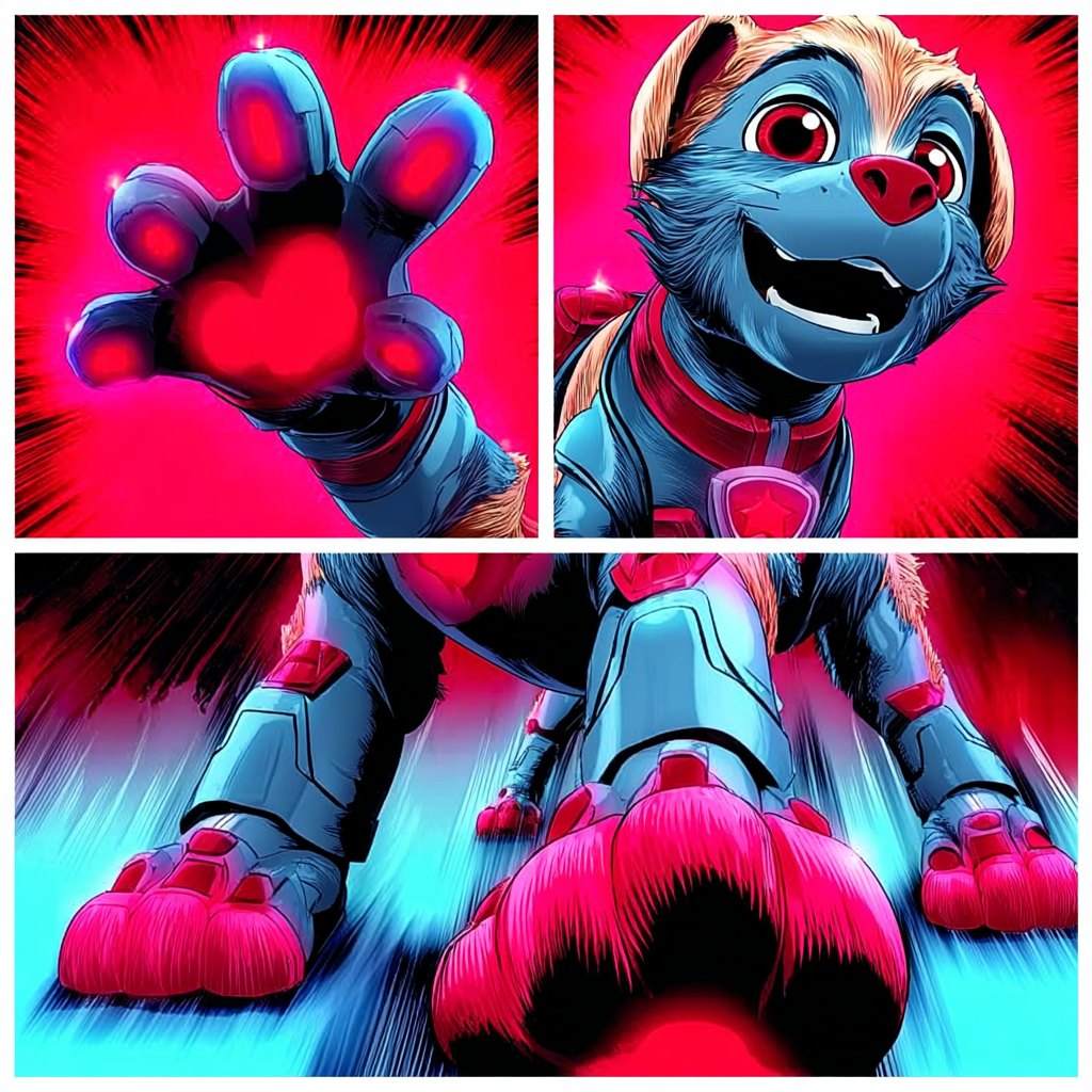 Create a 12 part comic image featuring Ella and Tuff. Panel 1: Mighty front paw glows red. Panel 2: Entire body grows to enormous size. Panel 3: Entire body grows triple in size. Maintain vibrant comic style with dynamic poses and expressions.
