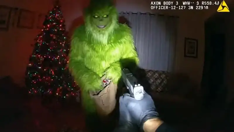 Police body-cam POV in a dimly lit living room. Chest-mounted wide-angle with slight fisheye distortion. Auto-exposure pumping. A green furry creature freezes mid-theft, caught stuffing holiday decorations into a large sack. Yellow eyes reflect the flashlight beam with an eerie glow. The creature's unnaturally wide grin reveals sharp teeth as it slowly raises furry hands in mock surrender. Christmas tree lights flicker in background. Overlay shows 'AXON BODY 3' | OFFICER: WHV-12 | REC ● | DATE/TIME | GPS COORDS | AUDIO ON | BATTERY %.