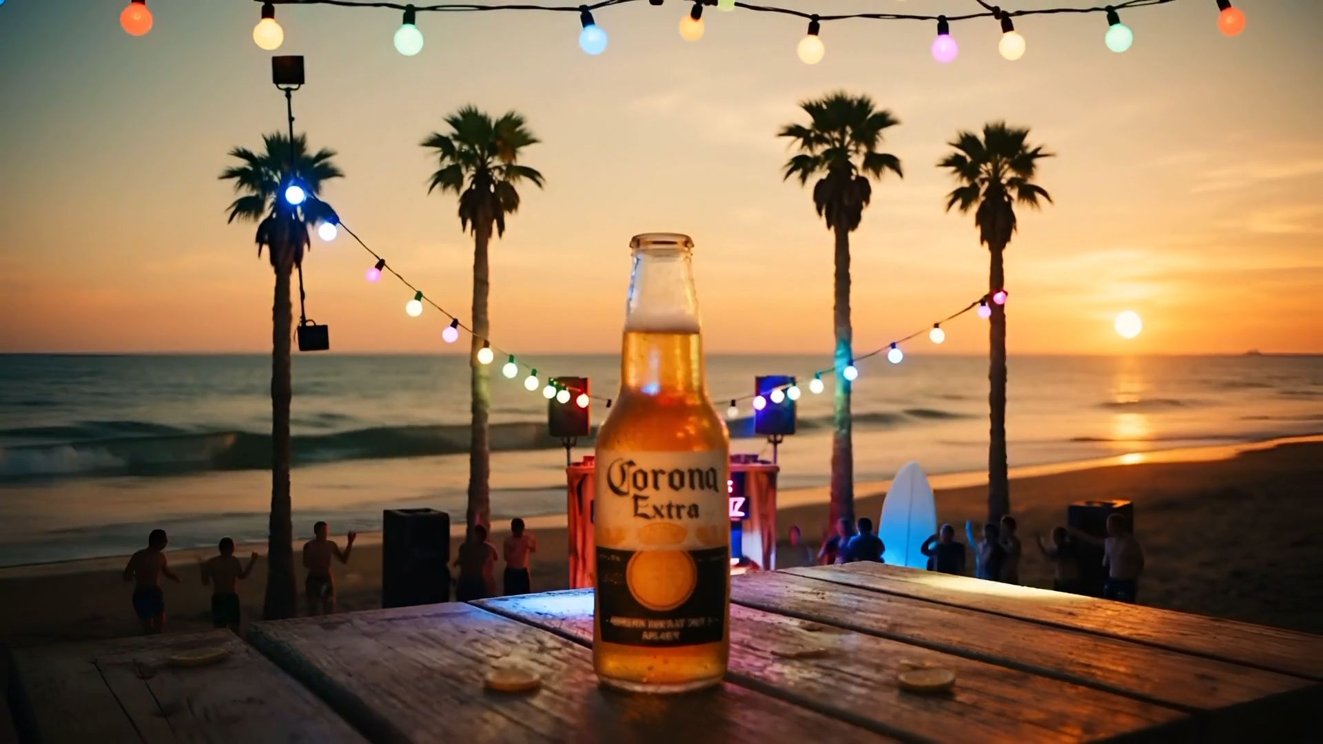 "action": "Corona bottle in foreground, beach rave in full swing behind it"