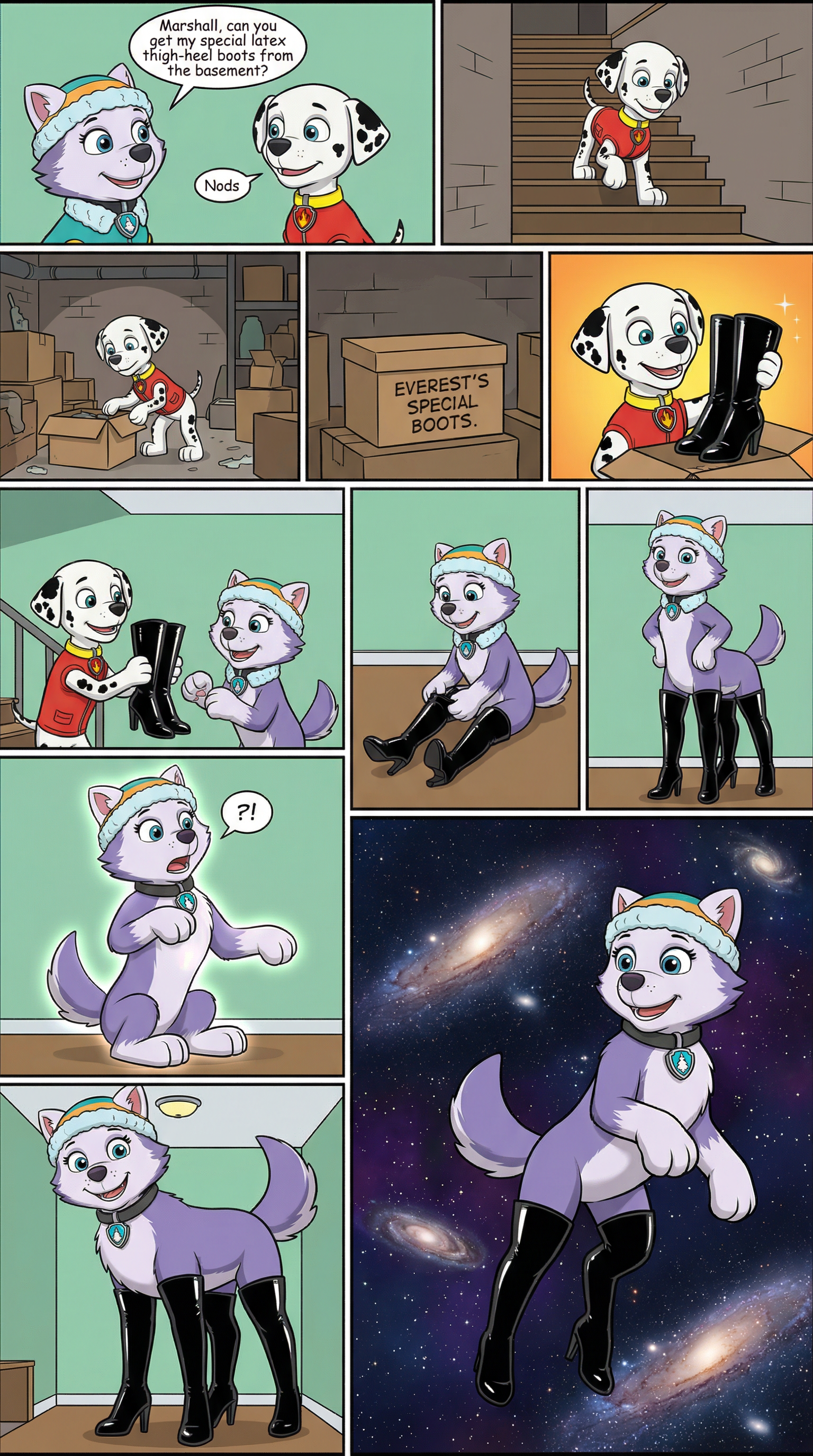 11 part comic Everest ask marshall get some latex thigh heels boots in basement and then marshall go in basement and then marshall grab Everest special latex thigh heels boots and then Everest put on latex thigh heels boots and then Everest body size growth enormous multiverse size