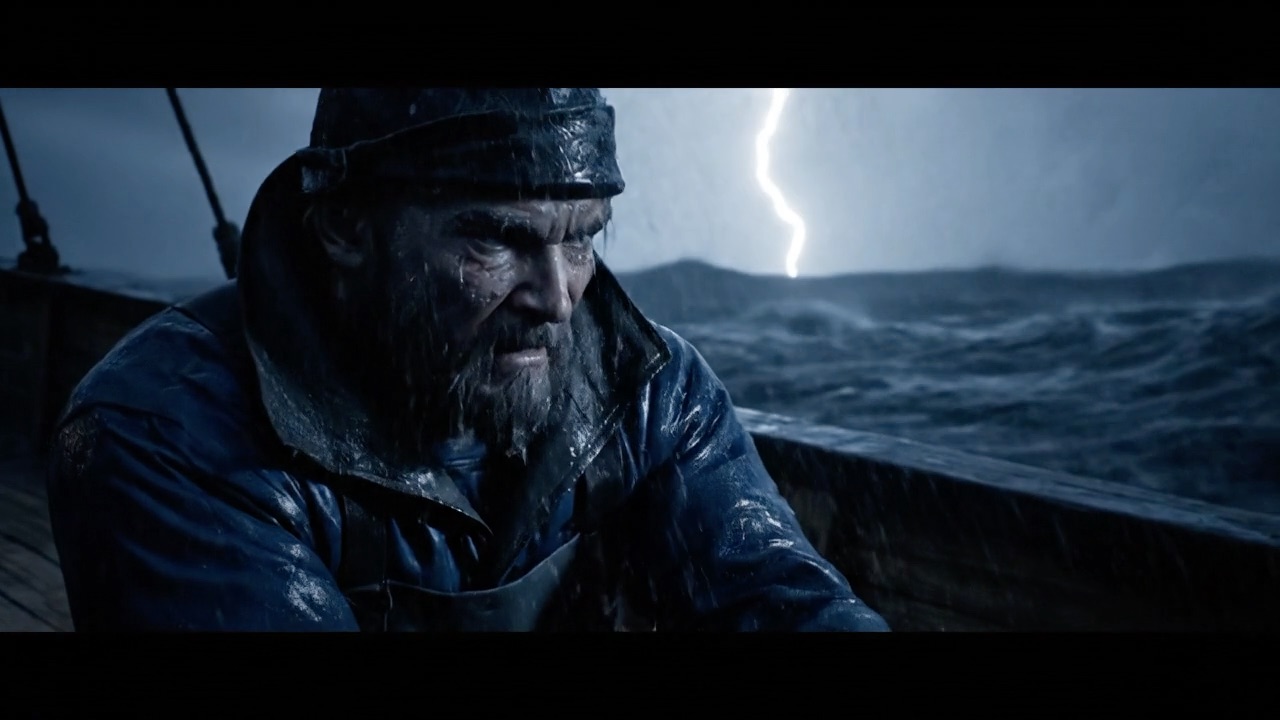 A cinematic close-up of a weathered fisherman on a wooden boat during a storm. Rain streaks down his face as he pulls a heavy rope. Huge, dark waves crash in the background. Lighting is moody with flashes of lightning illuminating the spray of the sea. 4k, hyper-realistic, high frame rate, slow motion
