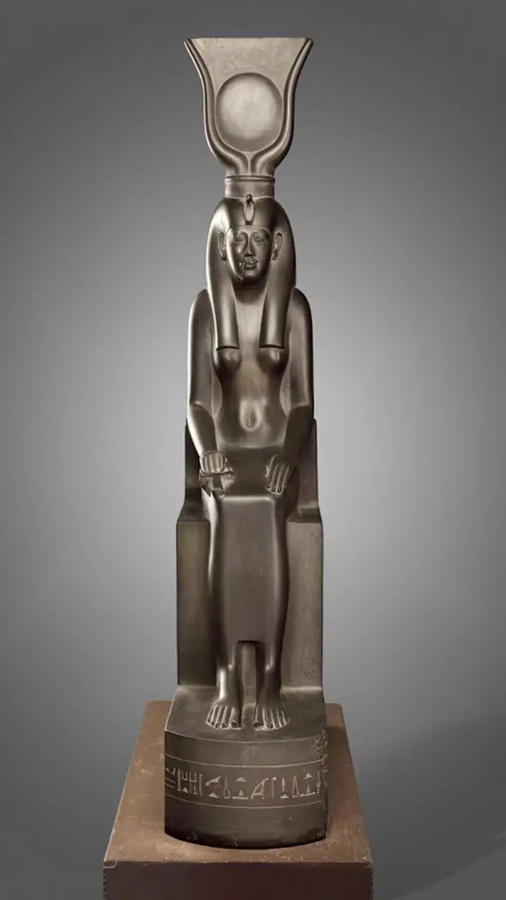 Generate an ultra-photorealistic video of an intricately carved pharaonic statue of queen Isis in the uploaded photo. The camera slowly pans and tracks in a tight circle around the statue's torso and head, highlighting the craftsmanship, the precise symmetry, and the texture of the aged basalt/granite. Use museum-quality, directional lighting to make the details pop. Cinematic slow-motion