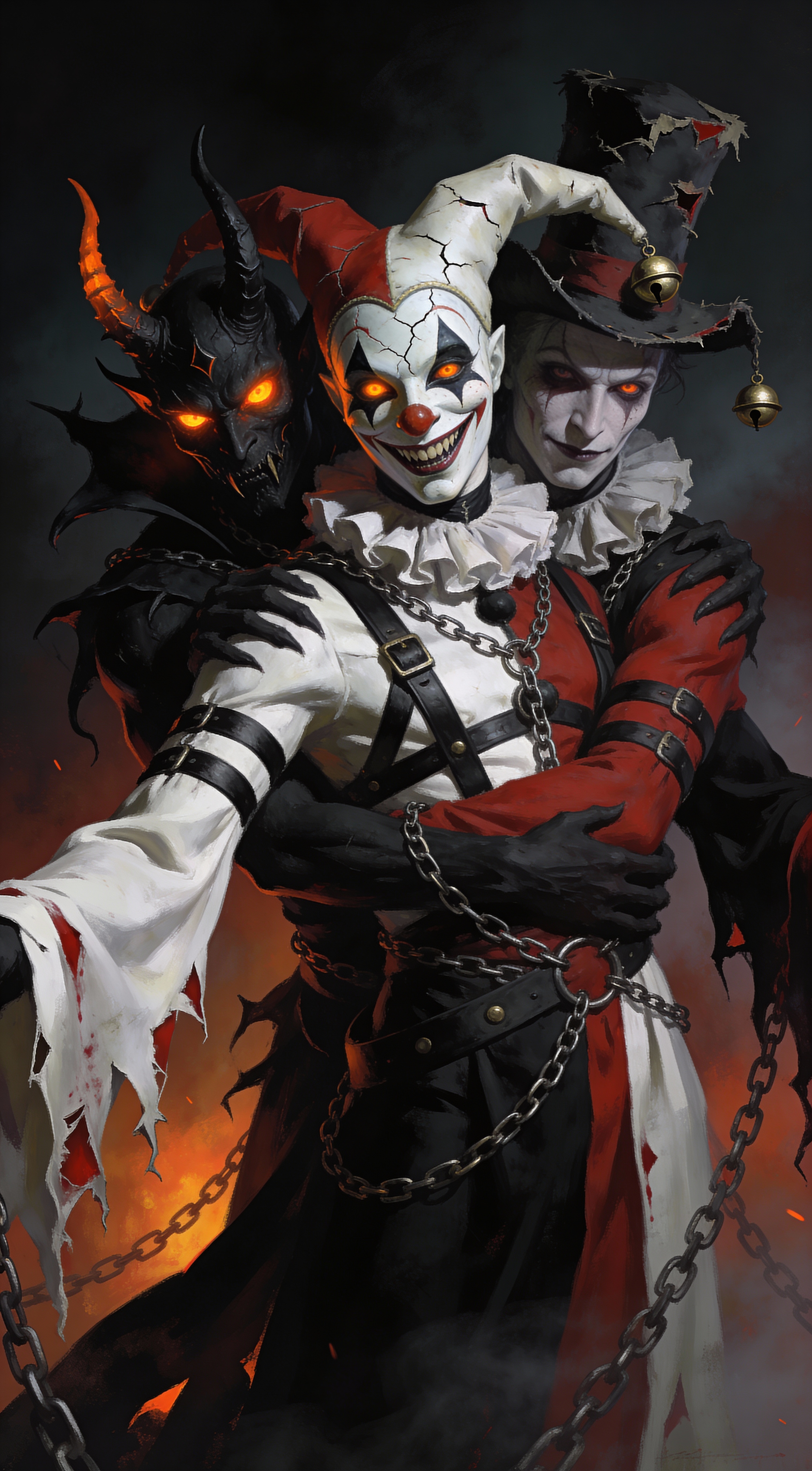A highly detailed, dark fantasy digital painting in a dramatic, painterly style inspired by artists like Zdzisław Beksiński and Brom. A sinister trio of demonic jester figures fused together in a nightmarish composition: one black-skinned demon with glowing orange-red eyes and jagged horns emerging from the shadows, another with a cracked white porcelain harlequin mask and manic grin, and a third wearing a tattered top hat with bells. Their bodies are intertwined with chains, ruffled collars, and leather straps in black, red, and white tones, creating an illusion of three faces merging into one monstrous entity. Long, flowing sleeves and jagged fabrics drape like torn curtains, with subtle blood-red accents and metallic glints on chains. Moody volumetric lighting with deep shadows, fiery highlights, and misty background, evoking themes of madness, duality, and infernal performance. Sharp focus on cracked mask textures, glowing eyes, horn details, and chain links. Ultra-high resolution, intense and unsettling atmosphere, cinematic vertical composition.