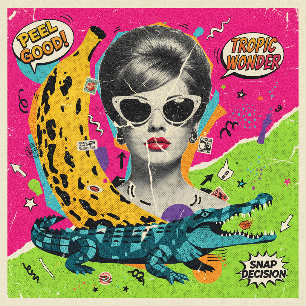 Pop art collage style design scene with halftone dot texture banana, pink and green contrasting background, vintage portrait and crocodile elements, trendy slogans, creative collage materials