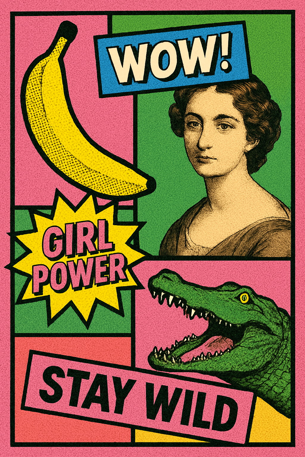 Pop art collage style design scene with halftone dot texture banana, pink and green contrasting background, vintage portrait and crocodile elements, trendy slogans and creative collage materials