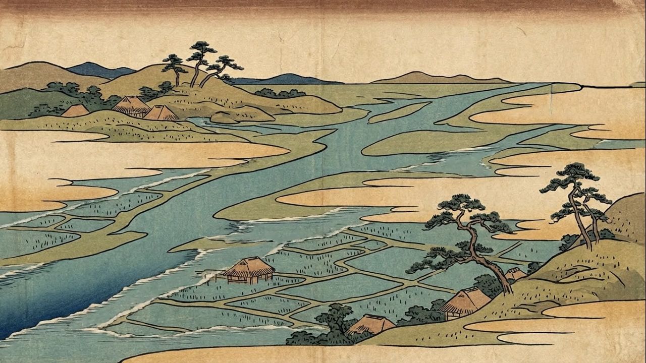 Landscape scene illustrated in Edo-period woodblock print style. The Uji River has overflowed its banks, spreading into the surrounding land. Water extends beyond the normal river channel, covering fields and low ground. The river is rendered as flat blue-green planes with gentle, irregular edges, not violent motion. Banks and landforms are simplified and partially submerged. No people are present. Perspective is flattened and slightly uneven, organized for clarity rather than realism. No dramatic waves, no storm imagery, no atmospheric effects. Colors are muted and limited. Linework is firm and slightly irregular, consistent with carved woodblock lines. Overall feeling is descriptive and factual, like an illustrated record of a natural event in a folk narrative.