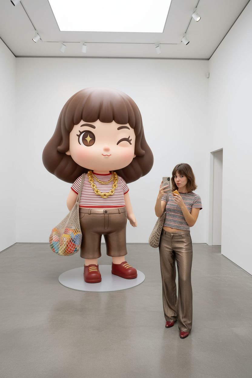 A figure at an art exhibition taking a photo with a large cartoon-style installation. The installation features giant cartoon style with big eyes and cute-style art aesthetic, referencing the clothing, accessories, hairstyle, decorations and other elements of the main figure in the input image to maintain high degree of consistency in main image, gender alignment and facial similarity. The installation is dressed in clothing and stands in natural posture diagonally behind and to the side of the figure. The installation's volume is larger than the figure with height approximately 50% greater than the figure's, creating strong contrast in proportions. The background is minimalist exhibition venue creating quiet and high-end atmosphere. The light and shadow are integrated with consistent atmosphere. No distortion or confusion in the figure's face, body or hands. Output images only, no text.