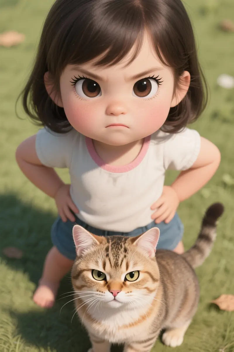 Overhead shot of cute little girl with big eyes, long eyelashes, hands on hips, and adorable cat both making angry expressions at camera, dreamcore style, centered composition occupying three-fifths of frame, ultra-realistic skin texture