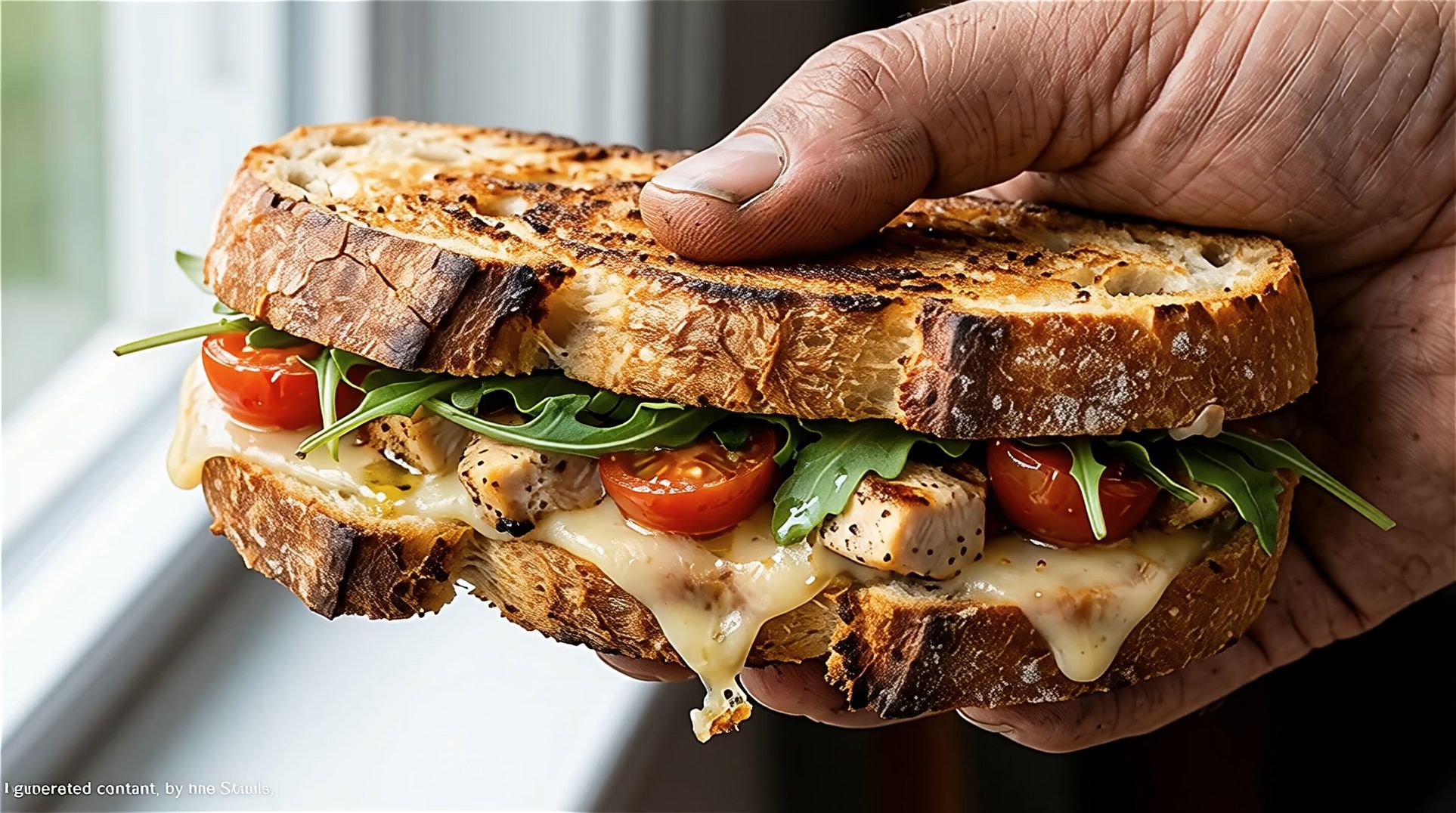 A sandwich, the hand moves the sandwich to the mouth, biting off the sandwich, dynamic motion with camera tilting up