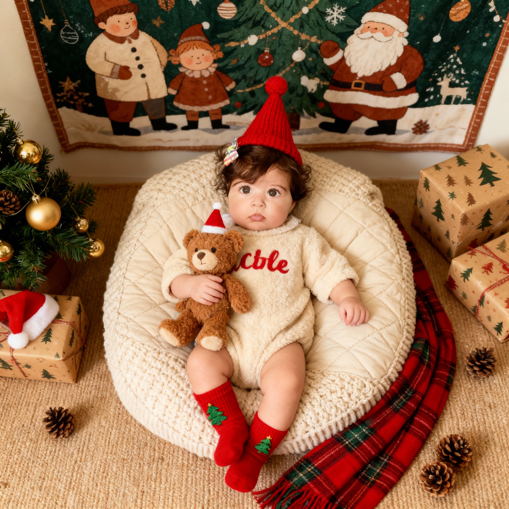 A cute and heartwarming Christmas-themed photoshoot with a retro fairytale feel. Adorable expression, soft skin, and a smiling face; wearing a beige plush bodysuit (with red lettering) + a red knitted pointed pom-pom hat + red socks (with green Christmas tree decorations at the cuffs); holding a brown plush teddy bear wearing a mini Santa hat. Scene Setup: Surface: Lying on a beige knitted quilted cushion, which is placed on a light brown burlap rug. Surrounding Elements: A red and green plaid scarf (placed along the edge of the cushion), several Christmas gift boxes (brown background with Christmas tree pattern), a small Christmas tree on the left (adorned with gold balls and a Santa hat), and scattered pine cones. Background: A vintage-style Christmas tapestry (pattern includes cartoon winter characters and Christmas tree decorations, in shades of dark green/caramel brown/cream white). Style: A warm and healing retro fairytale style with a slightly grainy film effect. Filter/Color Tone: A warm retro filter, with caramel brown + cream white + Christmas red as the main colors. Dark green; soft contrast, low saturation but rich and textured color, overall warm and soft atmosphere. Composition: Overhead (God's-eye view) centered composition, medium shot (covering the baby's entire body + surrounding key Christmas elements), slightly blurred background to highlight the subject. Lens/Lighting: Shallow depth of field; soft side natural light, creating a warm and enveloping feeling, with delicate and clear image quality. Output images only, no text.