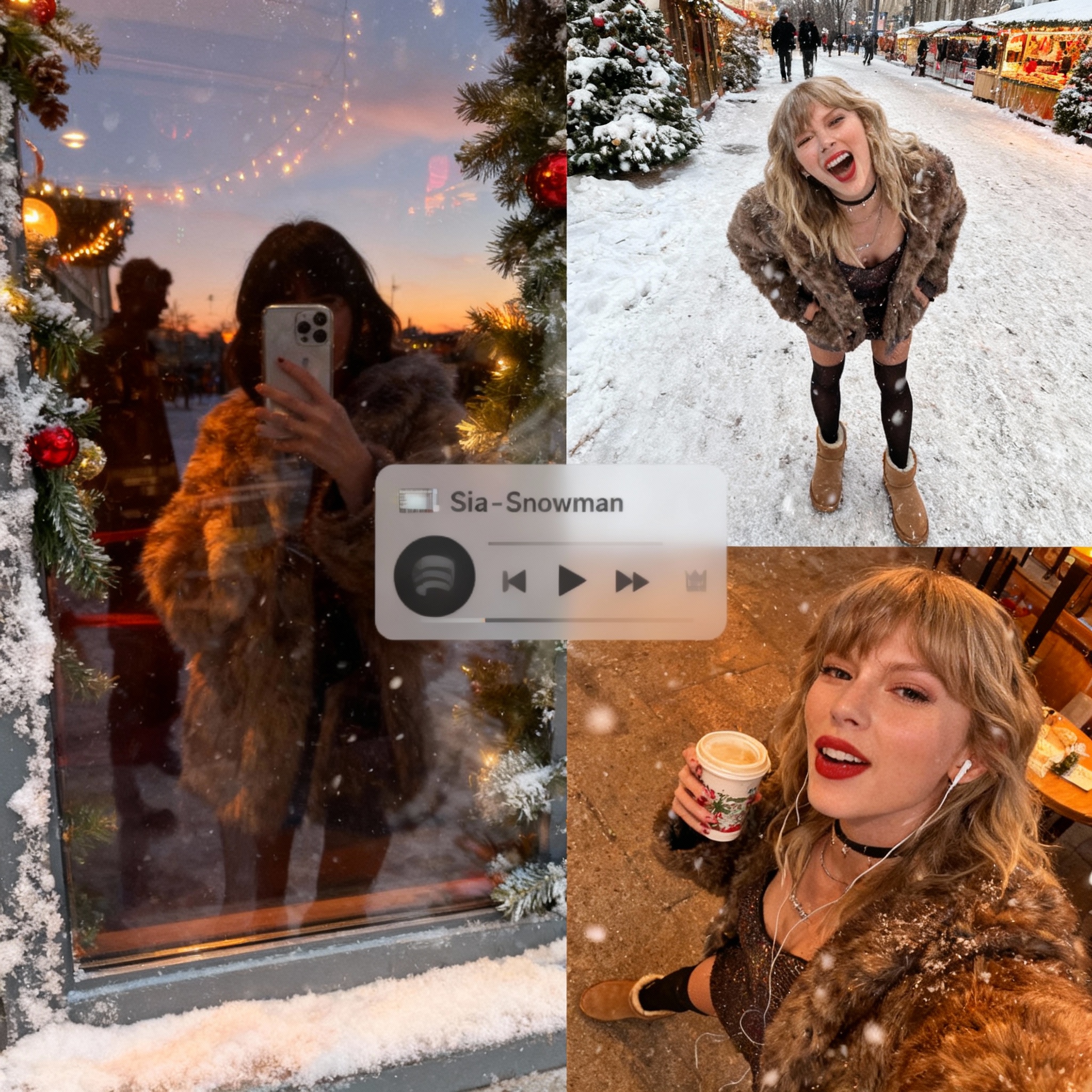 Editorial winter poster-style multi-panel collage with three distinct panels. Panel 1 (top left): Reflective shop-window shot at dusk with faint Christmas lights, garlands, frosted glass edges, warm highlights on fur, subject holding iPhone 17 Pro Max silver phone partially covering face, passing silhouettes, layered reflections, gentle ghosting, natural glass curvature distortion. Panel 2 (top right): Ultra-wide street portrait on snowy sidewalk or Christmas market, close downward-angled camera, subject leaning forward casually with hands in coat pockets, black tights and UGG boots clearly visible, falling snow with slight motion blur, subtle perspective warping for handheld unstaged feel. Panel 3 (bottom right): Intimate overhead selfie with warm street or café lighting, subject holding takeaway holiday drink (coffee or mulled wine), wired earphones visible, sharply detailed fur texture and winter fabrics, nostalgic holiday atmosphere with soft grain. Subject wearing short faux-fur coat, black tights, classic UGG boots throughout all panels. Aesthetic: spontaneous iPhone photography with candid, cozy, realistic feel. Global textures: soft snowfall, subtle analog grain, slight handheld imperfections. Color palette: warm ambers, soft reds, pine greens, muted winter greys. Minimal Spotify-style mini player overlay showing 'Sia - Snowman' floating across center of collage, rendered flat and clean with no shadows. Output images only, no text.