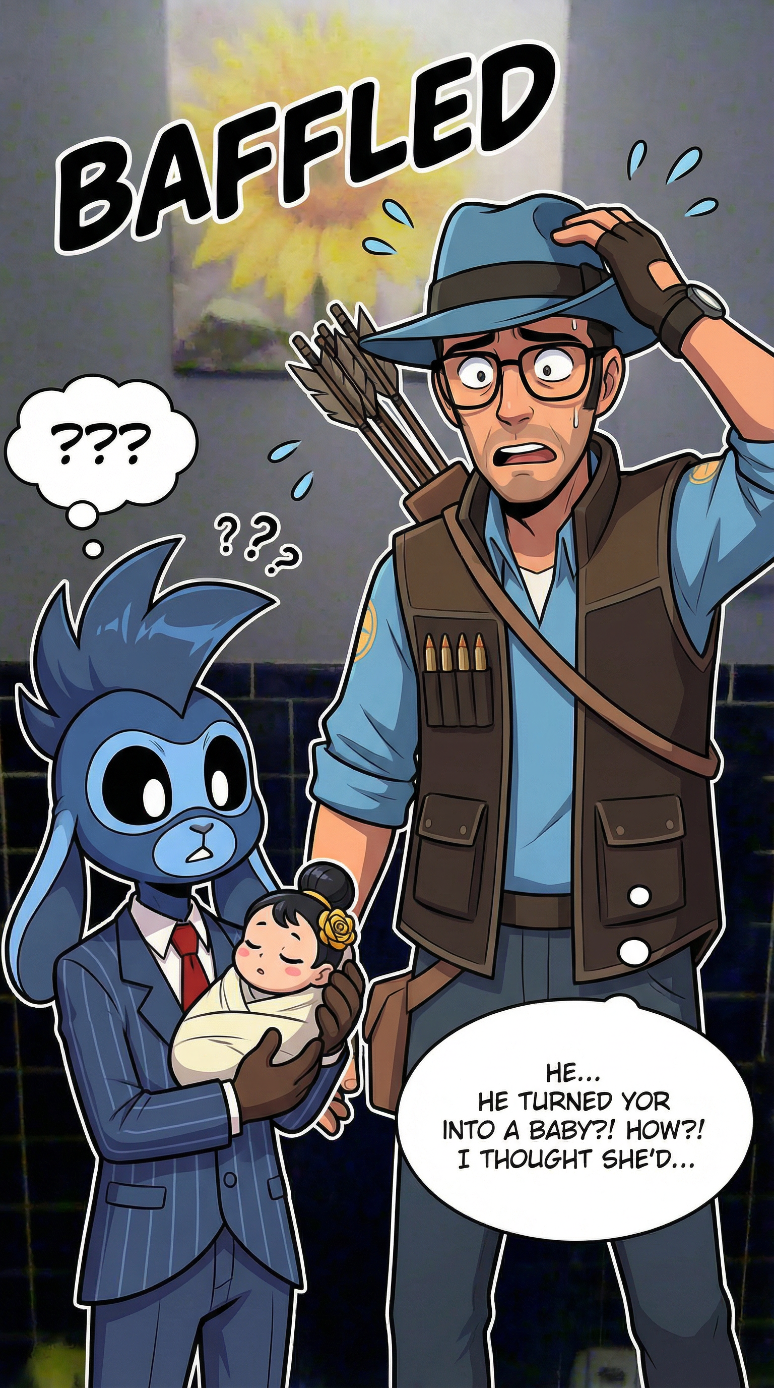 (Anime) (Comic) Deven (My Friend, The Huntsman Sniper) is baffled at how Bringo (The Spy) survived Yor, Bringo is just as confused as he didn't expect he'd be able to turn Yor into a baby but he did it (Use the reference images) (1 Panel)