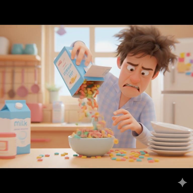 Same person attempts to pour cereal again, cereal still spilling. Show slow-motion of cereal falling like a mini disaster. Add text overlay: "EVERY. SINGLE. TIME." AI voice: "Why is this cereal always a ninja? It jumps everywhere!" Light comedic sound effects like boing or whoosh. 9:16 vertical.
